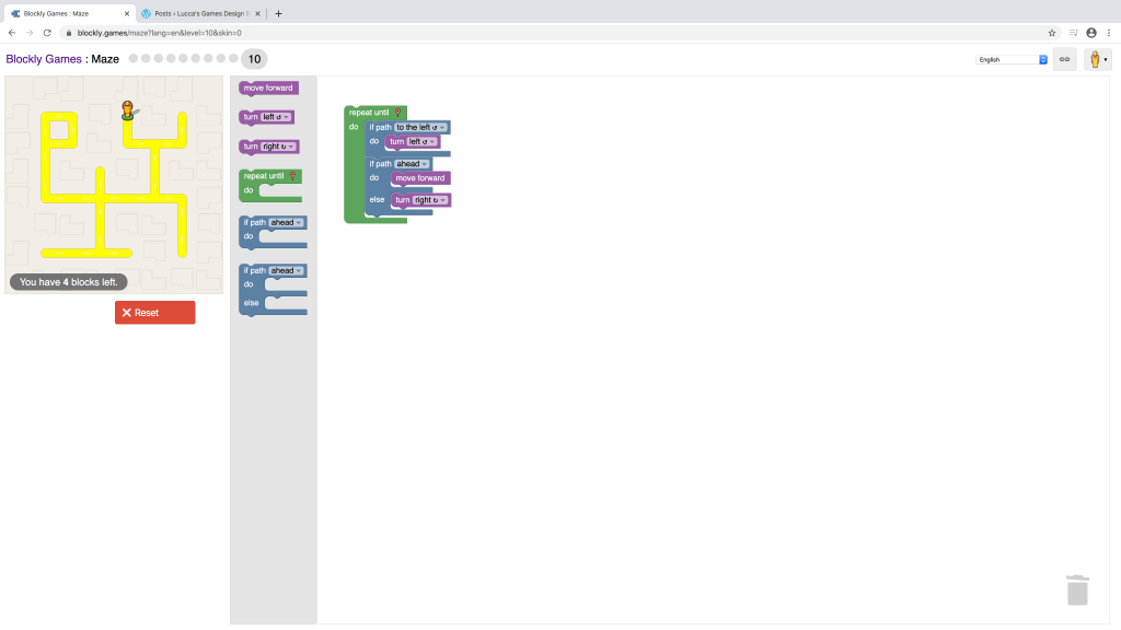 maze level 10 code Posted bylucca2006January 13, 2020January 14, 2020Posted inUncategorized https://blockly.games/maze?lang=en&level=10&skin=2#g4hqq7 Share this: Click to share on X (Opens in new window) X Click to share on Facebook (Opens in new window) Facebook Like Loading... Related